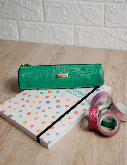 Mini cartucheras en cuero, sin forro, con cremallera y una banda ajustable a tu agenda; ideal para llevar tus útiles a la universidad, trabajo o en tu bolso de diario y estar siempre lista para tomar tus apuntes.