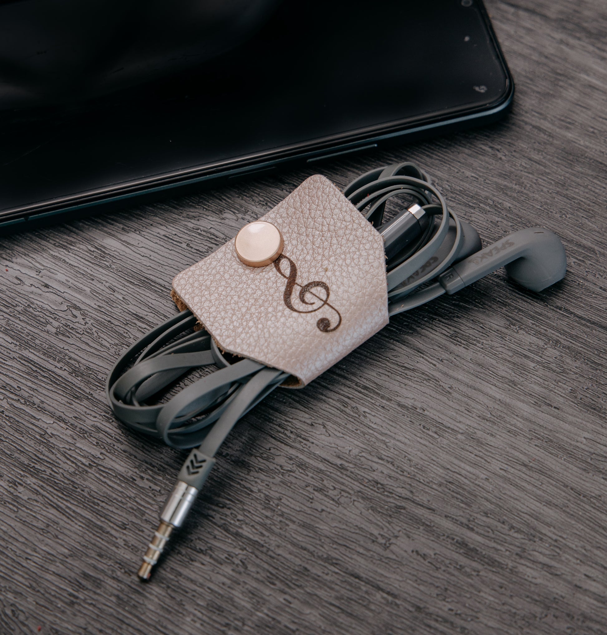Ata cables en cuero, sin forro y cierre de broche, ideal para llevar tus cables, cargadores y audífonos de forma organizada y segura.
