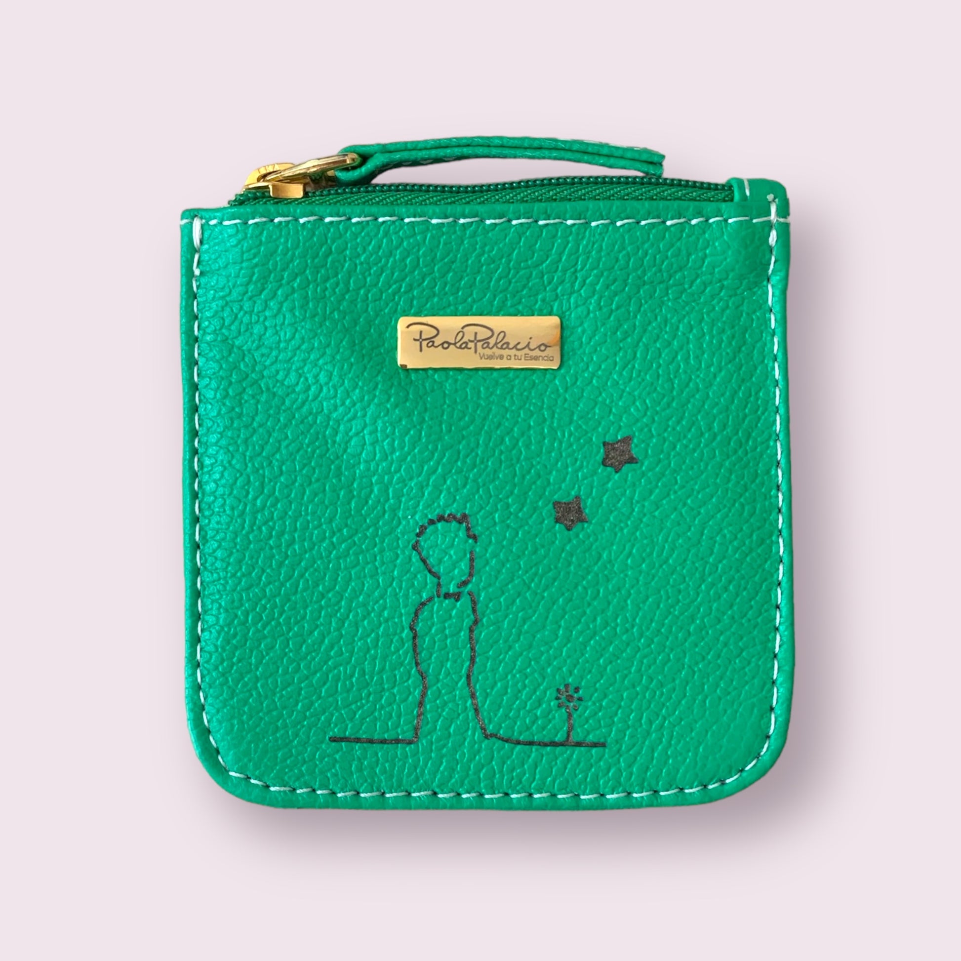 Monedero pequeño en cuero color verde y personalizado con imagen del principito, con forro y cremallera, e ideal para ponerle sitio a esas monedas que se te pierden. Su tamaño es compacto para llevar en tu bolsillo o bolso de mano.