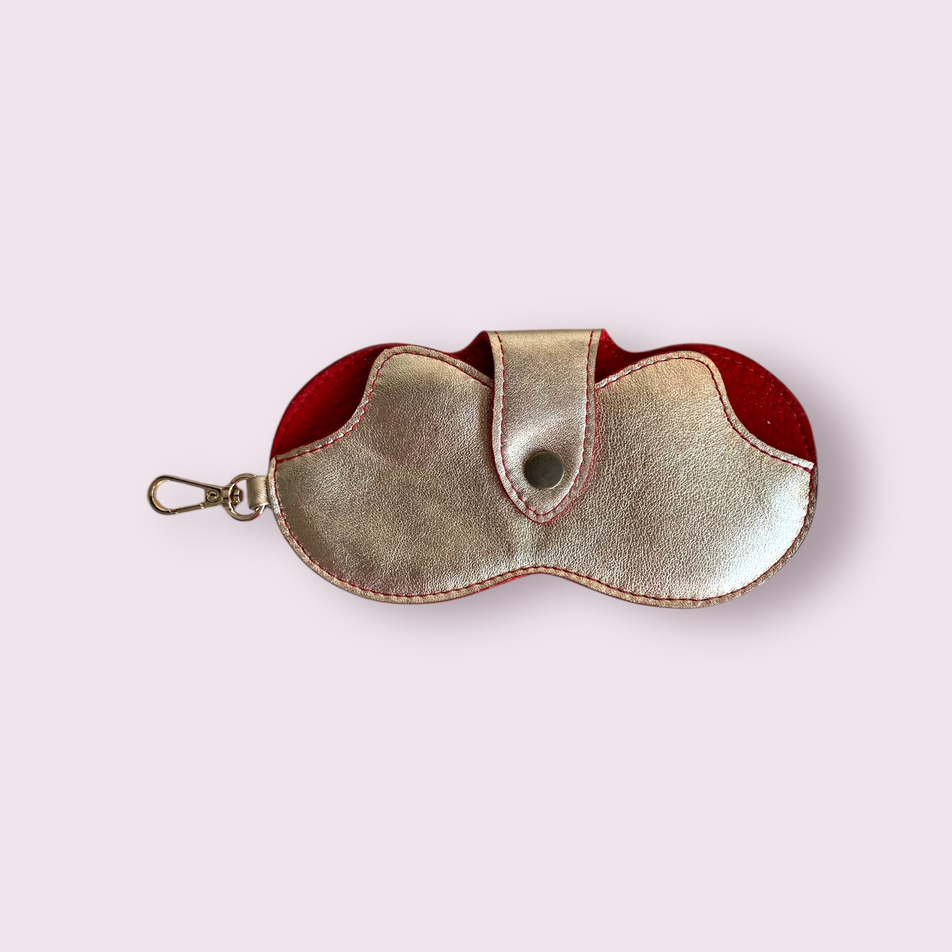 Porta gafas elaborado en cuero Dorado con forro ante rojo.